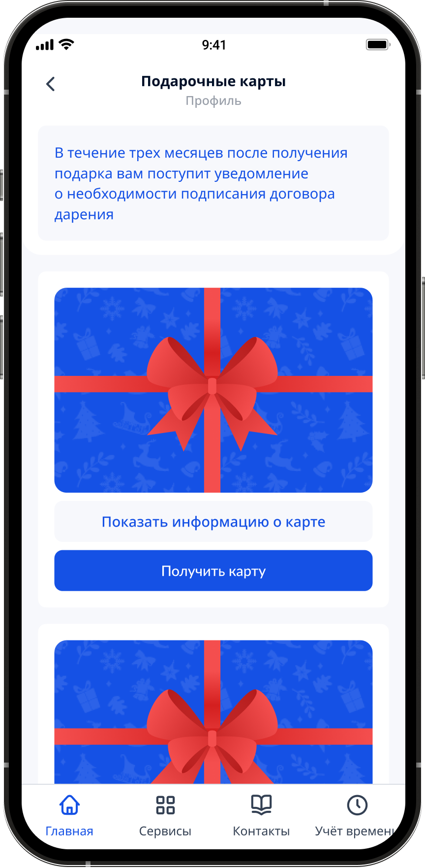 Главный экран раздела показывает все доступные подарки в виде карточек с ключевой информацией: номинал, условия и статус